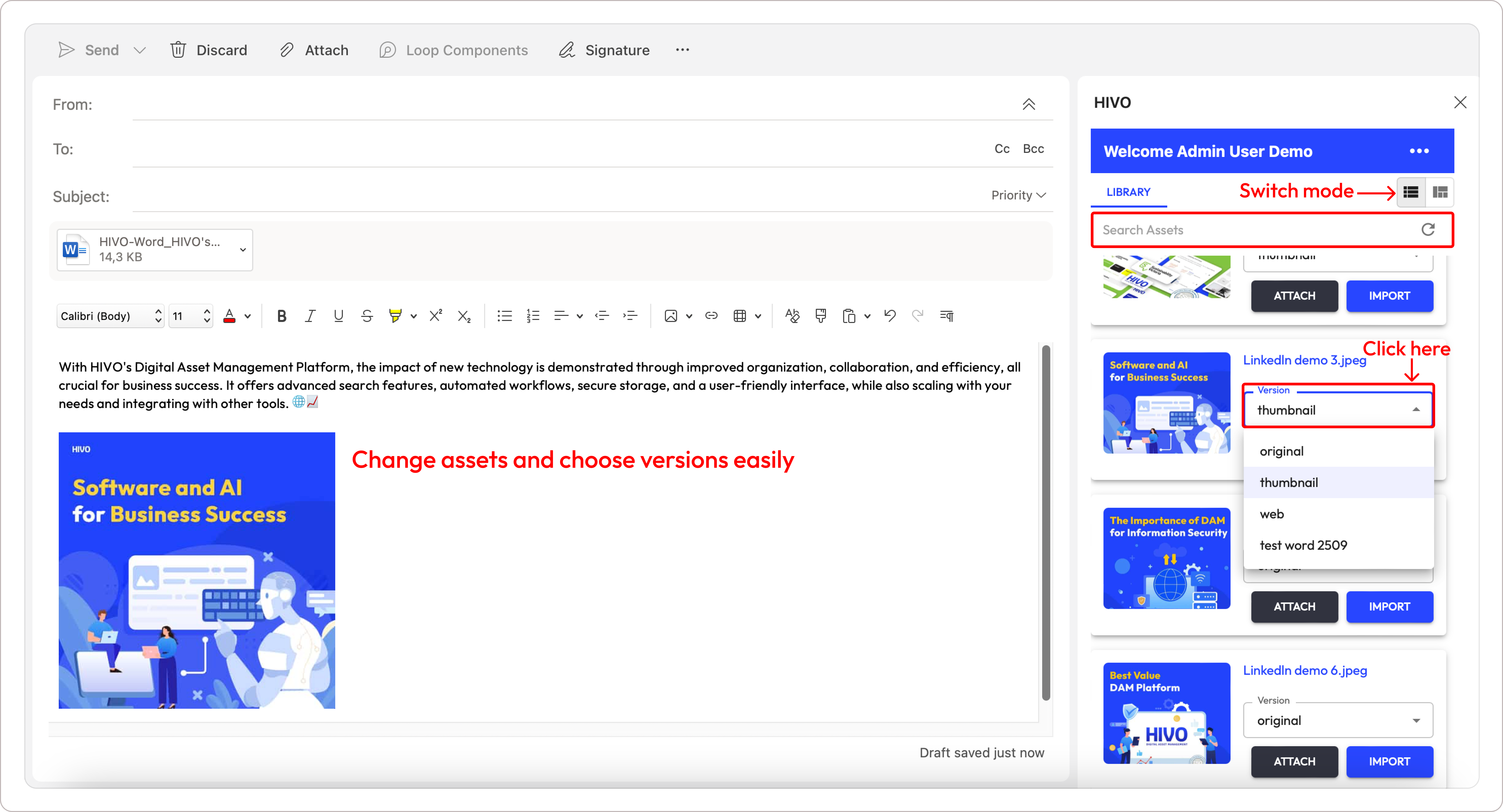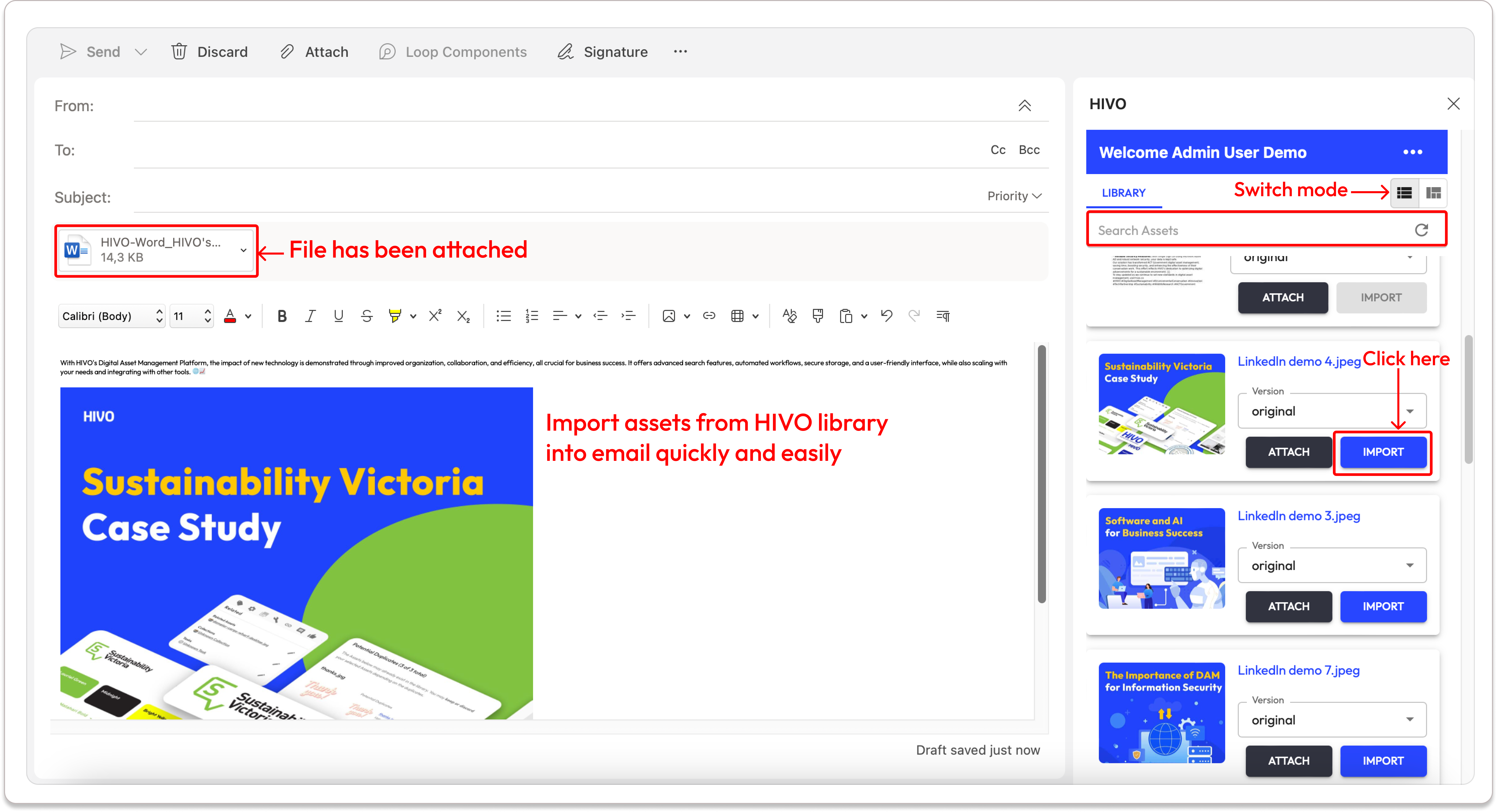 The HIVO Outlook Add-in simplifies digital asset management by allowing users to efficiently search for files, import them directly into their emails, or attach them easily.&#x20;