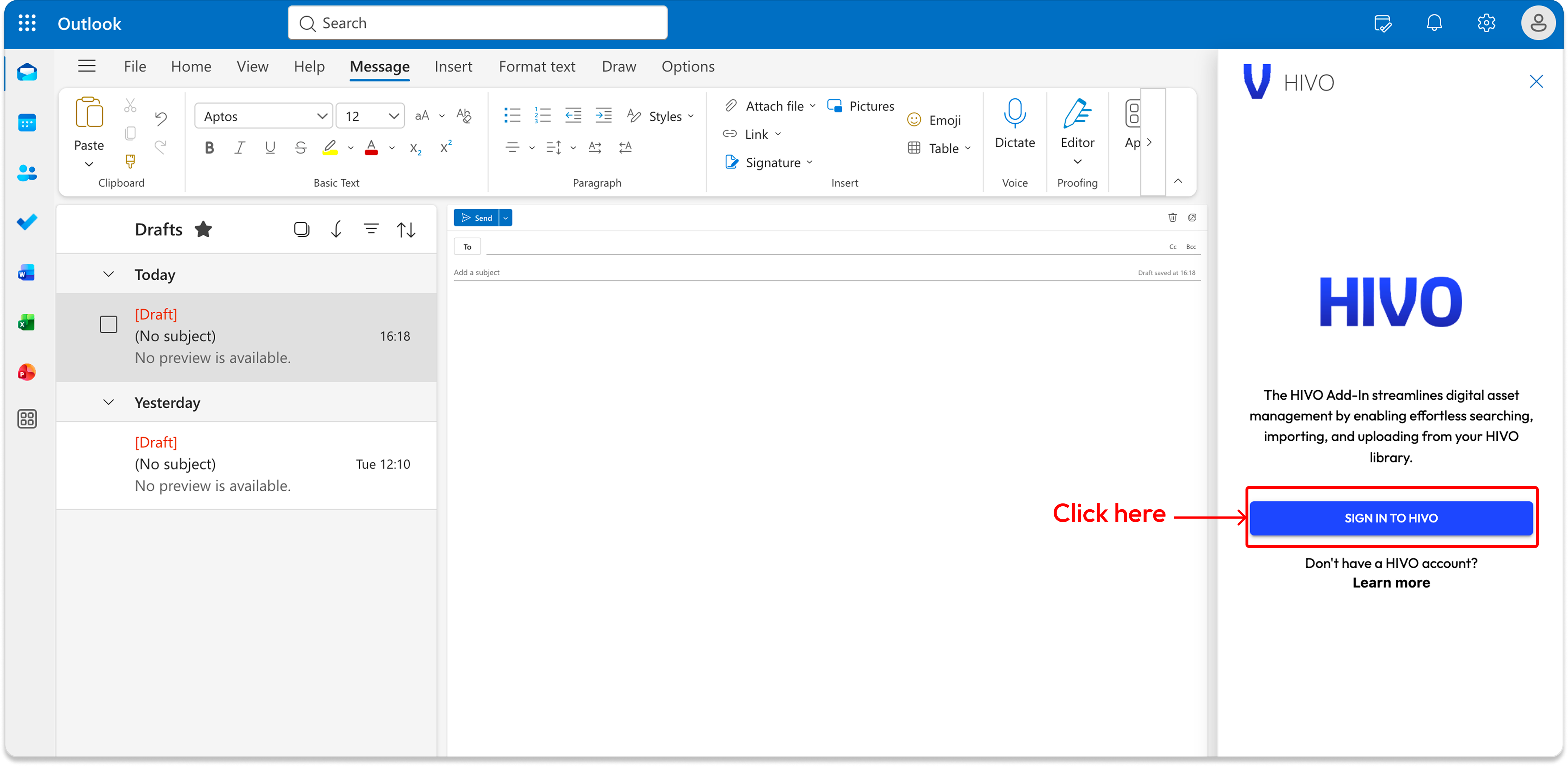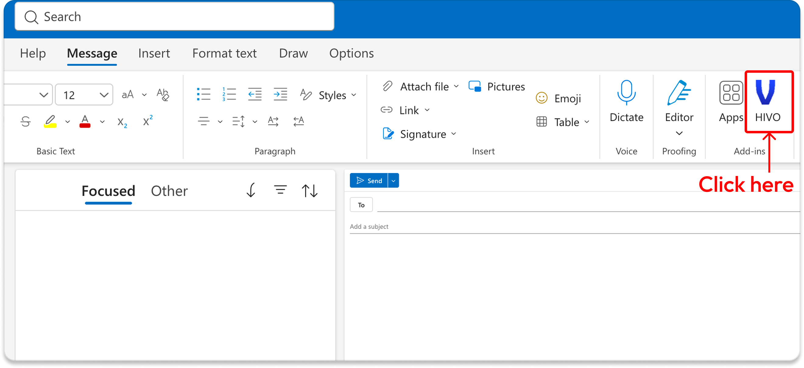 2. **Locate HIVO Add-in:** The HIVO add-in should appear as a panel within your email composition window.