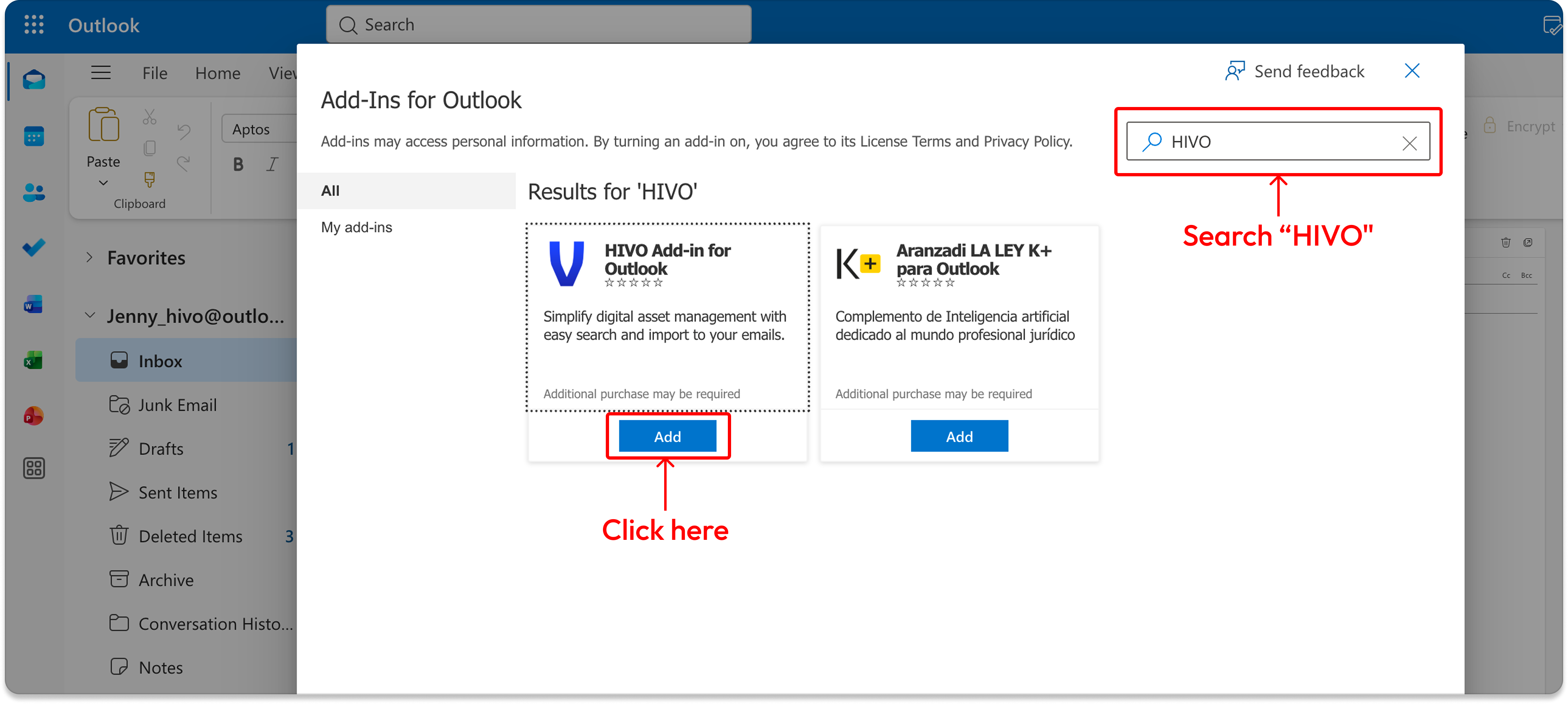 5. In the store, search for **“HIVO”**. Then, click **Add** to install the HIVO Add-in.&#x20;