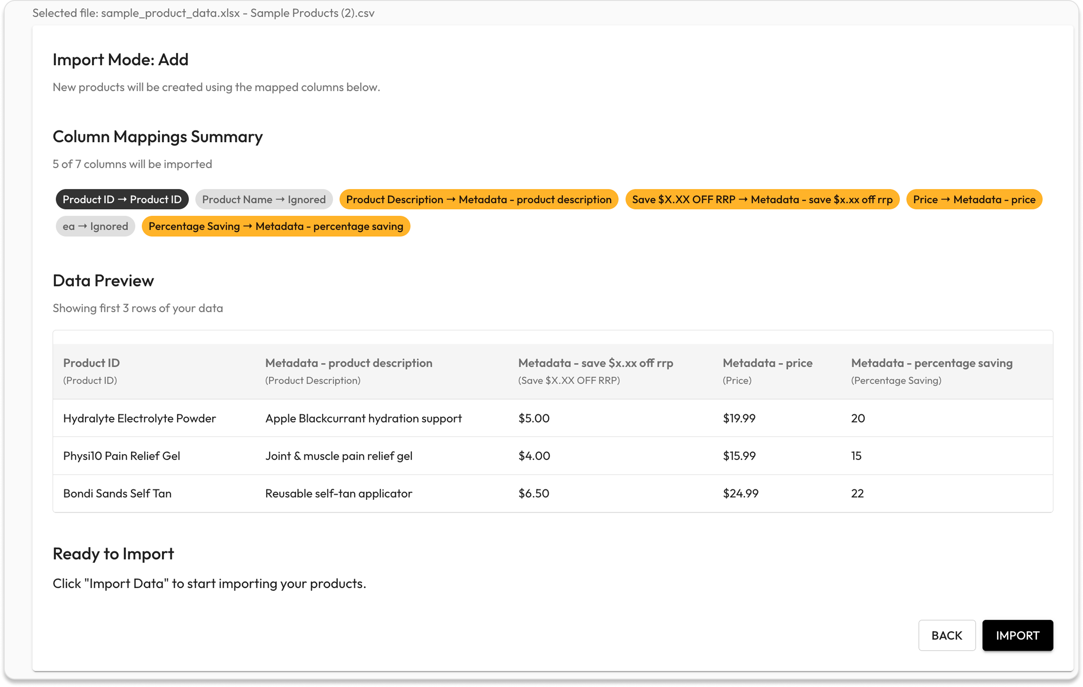 * **Product ID (SKU):** To update existing products, your CSV must include a column mapped to the internal Product ID so the system can identify the records.